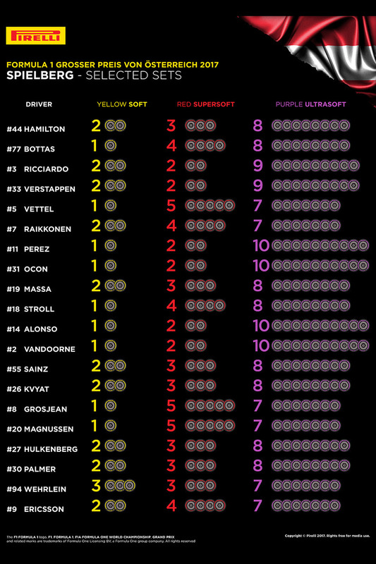 Mercedes заказала у Pirelli для своих пилотов по восемь комплектов UltraSoft, в то время как Ferrari – семь. При этом гонщики двух этих команд незначительно разошлись также в количестве Soft и SuperSoft: у Кими Райкконена и Валттери Боттаса по четыре комплекта резины средней жесткости, в то время как у Льюиса Хэмилтона и Себастьян Феттеля таких шин по три и пять комплектов соответственно.