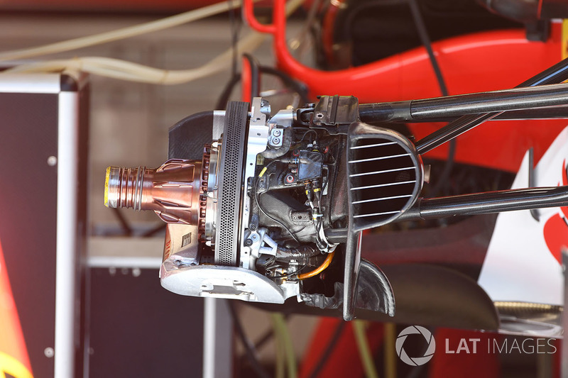 После гонки в Баку, где сразу несколько пилотов пострадали от обломков чужих машин, защитная решетка на воздухозаборнике тормозов выглядит обязательной к использованию. Тормозные диски Скудерия использует с шестью отверситями охлаждения в ряд, разбитыми на две группы по три.