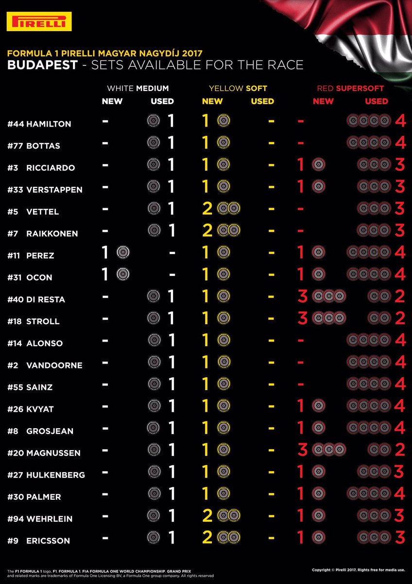 Традиционно Pirelli предоставили перед очередным Гран-при по 13 комплектов резины каждому пилоту, десять из которых команды могут выбрать сами.