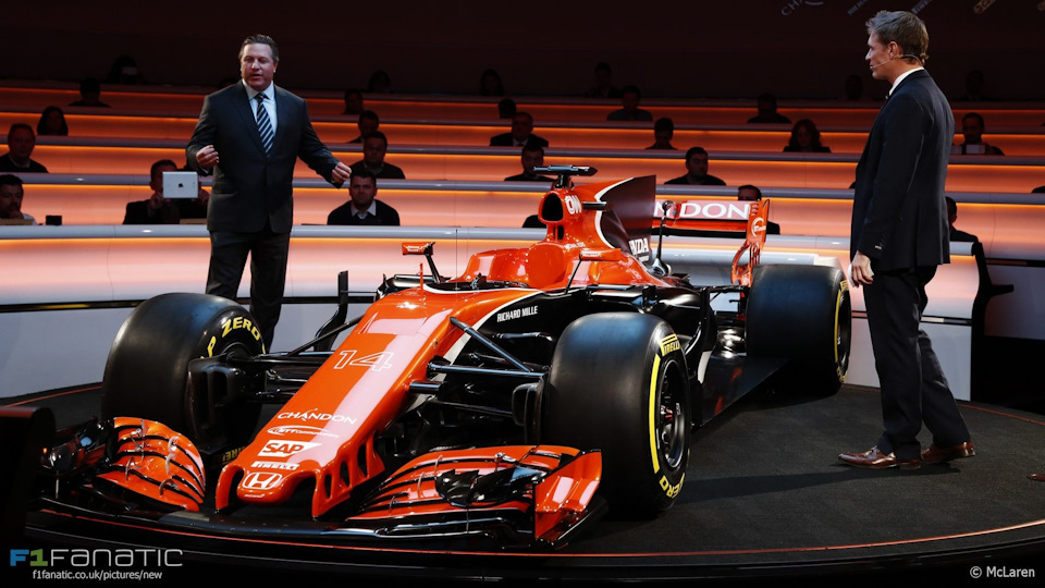 Зак Браун (слева) проводит презентацию болида для сезона 2017 – McLaren MCL32 Honda. Новая ливрея отсылает нас к временам Брюса МакЛарена и, по всей видимости, призванная отвлечь внимание от практически полного отсутствия спонсорских наклеек. Впервые с 1980 года в названии автомобиля отсутствует аббревиатура MP4 (Marlboro Project 4, в 1997 году официально смененная на McLaren Project 4), присутствующая на всех болидах Ф-1, созданных при Роне Деннисе.