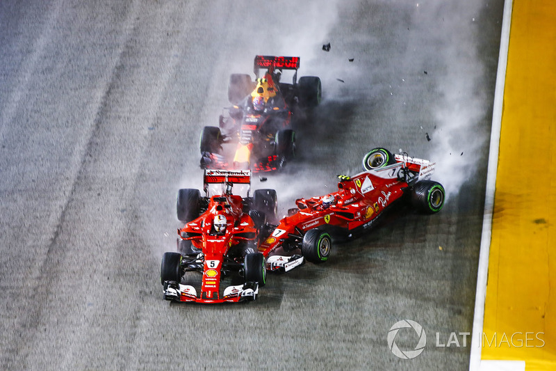 Когда машина Кими Райкконена, потеряв управление после удара в заднее колесо, стала смещаться вправо и ударила SF70H немецкого пилота, тот поехал дальше. Четырехкратный чемпион мира в тот момент не осознавал, что повреждения весьма серьезны, что его силовая установка теряет воду и масло, которые вытекают на дорогу под задние колеса.