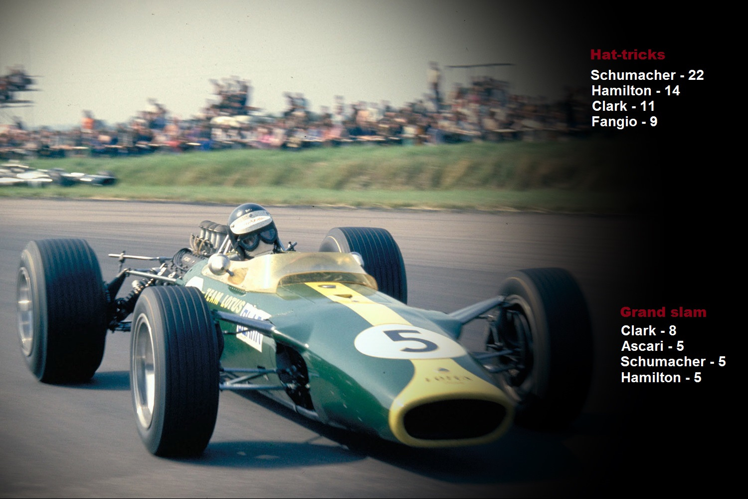А если говорить об «идеальном хет-трике» — «большом шлеме», то по этому критерию Льюис на Гран-При Великобритании этого года уже догнал Шумахера – у обоих по 5. Но в то же время, стоит отметить, что этот рекорд остался единственным непокоренным Великим Немцем – еще с середины 60-х это достижение безраздельно принадлежит шотландцу Джиму Кларку.