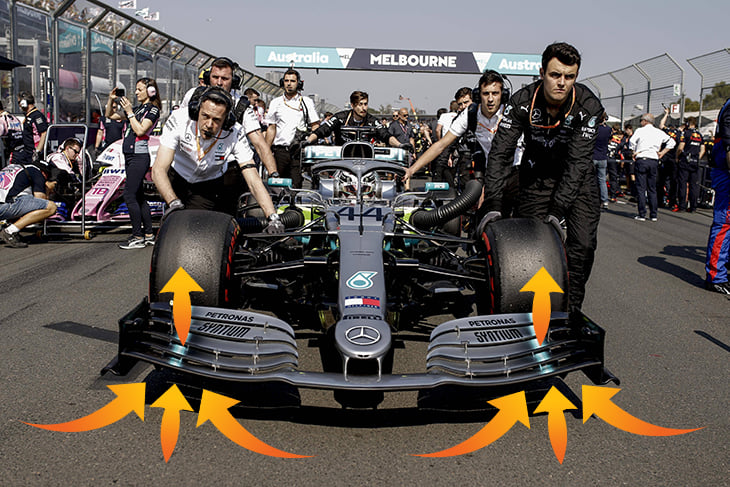 Перед стартом сезона 2019 года прошло много разговоров насчет нового регламента: с ним дефлекторы срезали вдвое по высоте и упростили передние антикрылья для снижения эффекта «грязного воздуха» и облегчения обгонов. Некоторые команды внезапно открыли инновационную конструкцию передней части болида с уникально загнутыми закрылками.