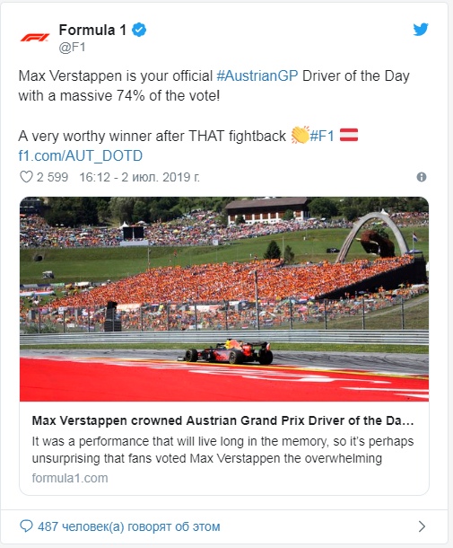 В понедельник упоминание о поляке и вовсе изчезло с официального сайта Ф1. А во вторник организаторы чемпионата официально подтвердили в своем твиттере, что гонщиком дня в Шпильберге стал Макс Ферстаппен, собравший 74% голосов.
