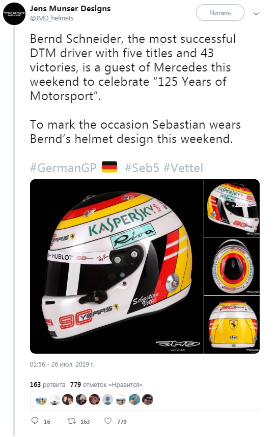 «Бернд Шнайдер – самый успешный гонщик DTM, пятикратный чемпион и победитель 43 гонок. В этот уик-энд он гость Mercedes и вместе с ними празднует 125 лет участия компании в автоспорте. В честь этого события в этот уик-энд Себастьян обновил дизайн шлема, отдав должное Бернду», - сказано в заявлении дизайнеров.