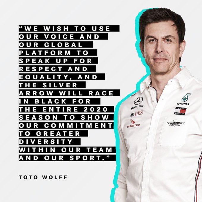 Тото Вольфф, руководитель команды: «Расизму и дискриминации не место в нашем обществе, нашем спорте или нашей команде: это основной принцип Mercedes. Но верных убеждений и мышления недостаточно, если вы храните молчание. Мы хотим использовать наш голос и нашу глобальную платформу, чтобы заявить об уважении и равенстве – по ходу всего сезона 2020 года «Серебрянные стрелы» будут гоняться в чёрной гамме, демонстрируя нашу приверженность к большему разнообразию в команде и нашем спорте.