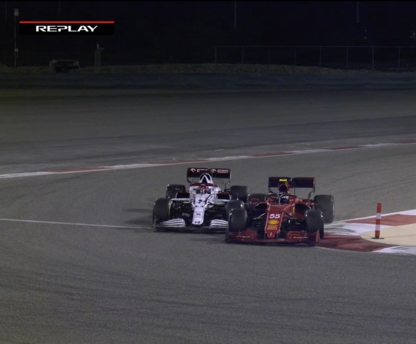 Райкконен собирался войти в поворот по стандартной траектории, но ехавший за ним Сайнс пытался проскочить по внутреннему радиусу. В результате ничего страшного не проищошло, но Кими пришлось резко отруливать в сторону, и контакт был не слишком сильным. Однако незадачливой парочке пришлось уехать в зону безопасности на внешней стороне поворота, где новоиспечёный пилот Ferrari Сайнс чуть было не въехал прямиком в рекламный щит.