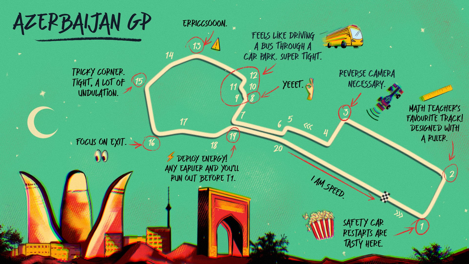 В пресс-службе команды Red Bull перед началом азербайджанского уик-энда нарисовали забавную карту Baku City Circuit с комментариями их резервного гонщика Алекса Элбона. Таец гонялся в Баку лишь раз, но и даже этого раза оказалось достаточно, чтобы оставить незабываемые воспоминанияю.