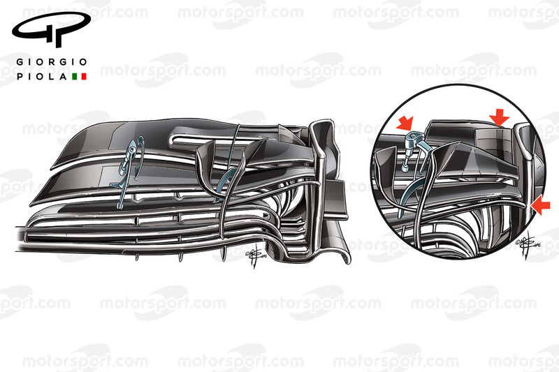 Последовав прошлогоднему примеру Red Bull, в Ferrari использовали собственную версию устройства, крепящегося над сплиттером и позволяющего контролировать его высоту. В то время как конструкция 2015 года была преимущественно карбоновой, мы обратили внимание, что её нынешняя инкарнация выполнена из металла.
